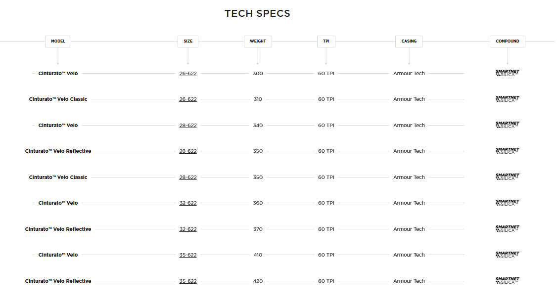Pirelli's previous experience and the relability of SmartNET™ Silica technology, combined with the tubeless-ready comfort and the resistance of the Armoud Tech™ technology, facilitated the creation of a new clincher tyre with a unique DNA - perfect for long-distances and various terrains: - Armour Tech™ construction combines a Nylon bead-to-bead high density layer to an aramid breaker and aramid fibers dispersed into the tread, resulting in a new level of protection against the worst road conditions which has never been achieved before - SmartNET™ Silica rubber compound guarantees safe rides and confidence-inspiring handling even in harsh conditions - Sizes from 26-622 up to 35-622 make it ready for Granfondo riding as well as long adventures rides, all in a tube and/or tubeless-ready configuration Cinturato Velo TLR is compatible with hookless rims according to ETRTO 5bar/73psi max pressure limit